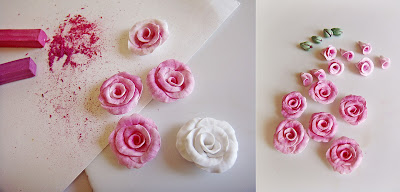 Сделав таким образом необходимое количество заготовок цветов, приступаем к тонированию. Измельчаем лезвием желаемые оттенки сухой пастели и СУХОЙ кисточкой втираем в сырые заготовки цветов.