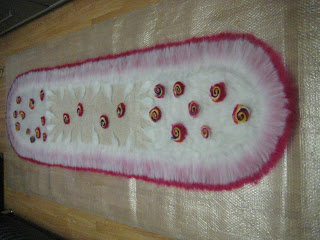 Концы шарфика удлиняем с помощью шерстки, закругляем их. Раскладка дополнительного полотна вдоль линии шарфа, а вот краешки все продолжаем раскладывать перпендикулярно краю.