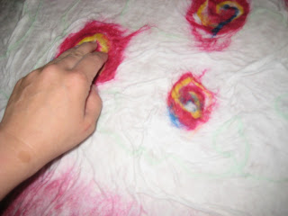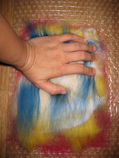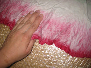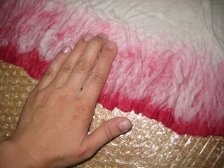 Теперь заканчиваем с раскладкой и принимаемся за валяние. Обильно смачиваем шерсть мыльным раствором, накрываем мусорными пакетами, аккуратно прижимаем руками, оказывая давление сверху вниз (ни в коем случае не двигать в стороны)