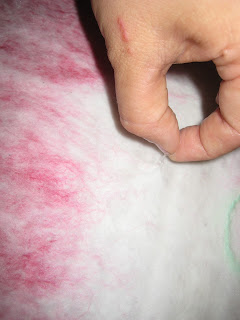 Теперь займемся воланом: валяем его нежно рукой, совершая колебательные движения только в одном направлении - вдоль волокон. При этом их надо слегка растягивать, чтобы получилась волна.